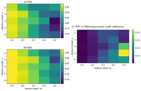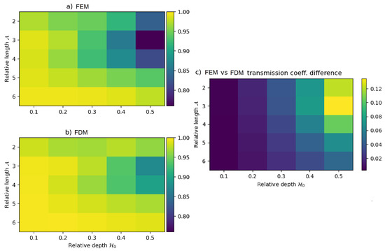 Transmission from symmetric smooth defect: (a) transmission coefficients from FEM model (FEM), (b) transmission coefficients from Mindlin model (FDM), (c) relative difference between the reflection coefficients.