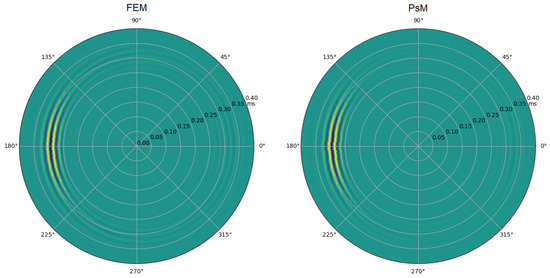 In the 2-D FDM, a one-dimensional grid is used, while a 2-D grid is employed in the PsM studies. Each grid node in the 2-D FDM has two degrees of freedom, whereas nodes in the PsM have three degrees of freedom. A convergence analysis was performed through iterative grid refinement, establishing an element size of 2 mm (corresponding to 18 grid nodes per wavelength of the mode at 50 kHz) for the 2-D FDM grid, and 4 mm (equivalent to 9 grid nodes per wavelength) for the PsM grid. Based on the size of the domain, a simulation time of 400 s was set, using a step increment of 0.5 s, which is determined to be sufficient according to the Courant–Friedrichs–Lewy criterion [37]. The representative time step was verified by reducing the time step size until the maximum amplitudes of the received signals differed by less than 1%. To minimize reflections from the edges of the plate and maintain a compact model, we incorporated absorbing regions. Sponge layer damping is utilized, applying a viscous damping coefficient that increases as one approaches the edges, which effectively absorbs outgoing waves. This damping mechanism is included in the constitutive equations of the Mindlin model as a first-order time derivative, efficiently reducing wave amplitudes in the boundary regions. In both models, excitation was applied using a five-cycle tone burst with a center frequency of 50 kHz, modulated by a Hanning window. Numerically stable excitation of the mode was achieved by applying a unit force to the main grid node, with adjacent nodes receiving 75% of the amplitude and diagonal neighbors receiving 50% (in the PsM method). This configuration was specifically designed for the studied frequency range to ensure that nearly pure mode generation occurs when applying the normal force at this frequency [38].