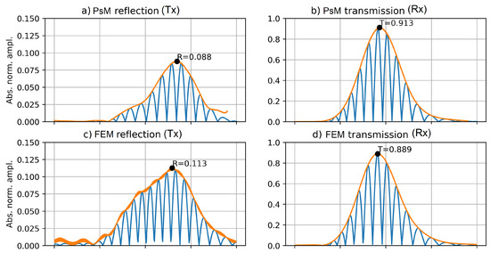 The absolute values of the reflection and transmission signals measured at points Tx and Rx, respectively, are presented in Figure 12. The signals from both the Mindlin and FEM model are normalized by the sum of their respective maximum amplitudes of transmitted and reflected signals. Although this normalization approach is not physically accurate, since the energy content also depends on the spatial width of the wave packet, it provides a reasonable basis for initial comparison and visualization of the signals. The reflected signal is longer in duration compared to the transmitted signal, consisting of a weaker initial component from a larger, smoother defect and a stronger component from a smaller, deeper defect with sharp edges. The agreement between the models is excellent, showing similar amplitudes and envelope shapes.