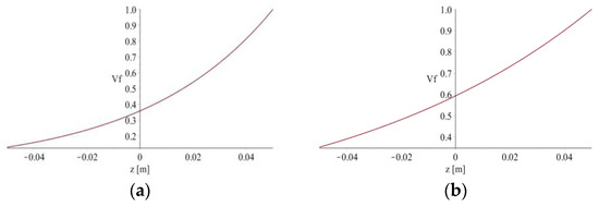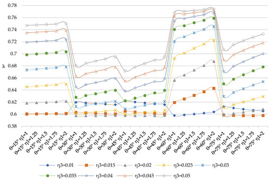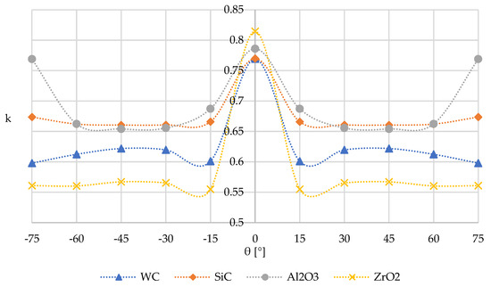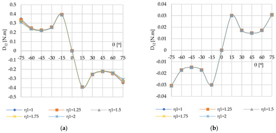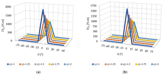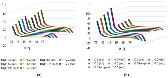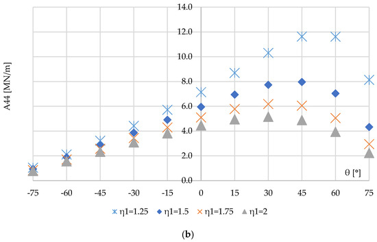 Concerning the shear correction factor, it was found that the Al-WC and Al-ZrO2 FGM auxetic materials share a similar evolution profile, while the Al-Al2O3 and Al-SiC FGM honeycomb auxetic materials present another trend. This is attributed to the influence of the greater or lesser similarity of the constituent materials’ Poisson ratios. Regarding the geometric parameters, the angle of the unit cell has a great influence on the shear correction factor, as the unit cell aspect ratio does. The influence of the aspect ratio , although visible, is minor when compared with .