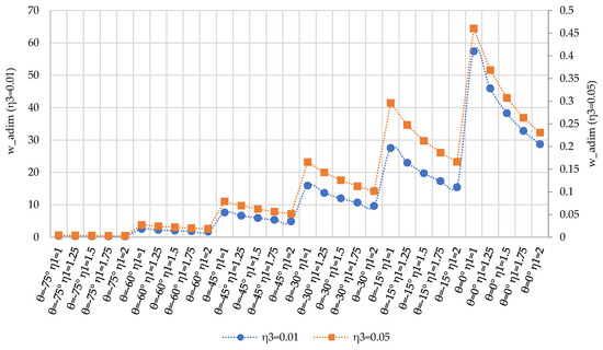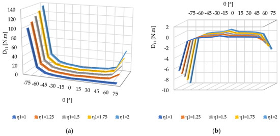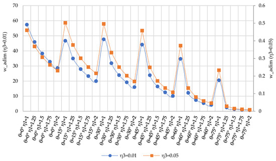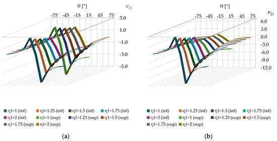 Concerning the beams’ maximum transverse deflection, it was again possible to identify two trends. When the FGM constituent materials possess closer Poisson ratios, the beams’ non-dimensional maximum deflection increases from the angle to the angle and then starts decreasing. When the Poisson ratios of the ceramic materials are lower than that of the aluminum, the beam’s maximum non-dimensional deflection profiles present an oscillating trend regarding the evolution along the different angles studied. Regarding the geometrical parameters, the influence of the aspect ratio on the non-dimensional maximum deflection is more effective for angles between and . Note that, when considering the evolution of this quantity as a function of the angle, for positive angles and when , the decreasing trend is slighter in comparison with other values. The relation between the thickness of the cell and the length of the inclined segments ( shows a direct influence on the maximum deflection.