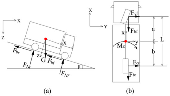 Lowercase x, y, and z are utilized to represent the coordinate system of the vehicle, while uppercase X, Y, and Z denote the coordinate system referenced to the Earth. The designations, as well as the forces acting along each axis, are illustrated in Figure 2. By employing small angle approximations, the following three governing equations can be derived separately for the local longitudinal (x-axis), lateral (y-axis), and vertical (z-axis) directions. The following Equations (1)–(19) refer to the research results of Torbic et al. [17].