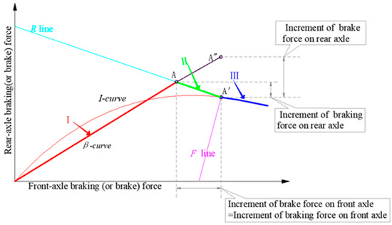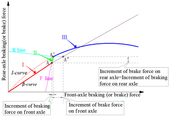 Stage I. This stage is marked in red in Figure 3. Specifically, the braking forces on each axle increase along the β-curve. When the braking forces increase to point A, the front wheels lock up while the rear wheels do not, marking the end of stage I.