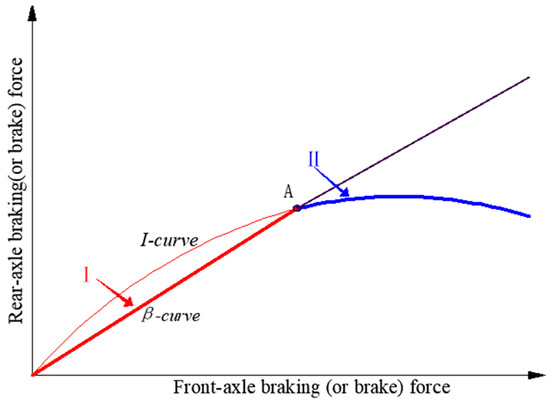 - : the position of the β-curve lies above the I-curve, signifying that during braking, the rear wheels consistently experience lock-up before the front wheels.