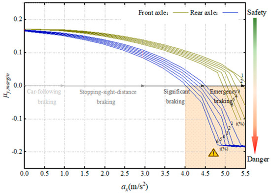 Equations (4) and (5) demonstrate that the braking results in the weight transfer from the rear axle to the front axle. The magnitude of this weight transfer can be expressed as . It is worth noting that a higher deceleration rate corresponds to a greater amount of weight transfer.