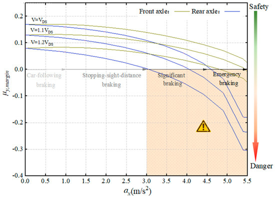 Equations (12) and (13) depict the quasi-static friction demands for the front and rear axles for cornering during braking, respectively. These equations demonstrate the weight transfer from the rear axle to the front axle, resulting in an increased vertical force on the front axle. Consequently, a lower is sufficient to meet the cornering requirements. Conversely, the vertical force on the rear axle decreases, necessitating a higher to satisfy the cornering demands.