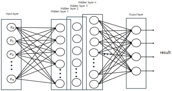 One of the models used in this study, the multi-layer perceptron (MLP), is a model that predicts continuous values based on numerical data using regression analysis. As shown in Figure 2, the MLP for regression analysis consists of an input layer, one or more hidden layers, and an output layer, with neurons in each layer processing data through activation functions. The input layer receives numerical data, and in the hidden layers, each neuron transforms the data using weights and biases. The output layer then produces predicted continuous values [24]. In this process, non-linear activation functions (e.g., ReLU, Sigmoid) are used to learn complex patterns in the data, and the backpropagation algorithm adjusts the weights to minimize loss functions such as mean squared error (MSE) or mean absolute error (MAE) [25,26]. MLP regression is particularly effective in learning data with multi-dimensional and non-linear relationships, and it has been applied in various fields, such as housing price prediction, stock market forecasting, and climate data analysis [27]. However, careful tuning is required, as inappropriate hyperparameter settings (e.g., learning rate, number of hidden layers, number of neurons) or insufficient regularization techniques (e.g., Dropout, L2 regularization) can lead to overfitting [28].