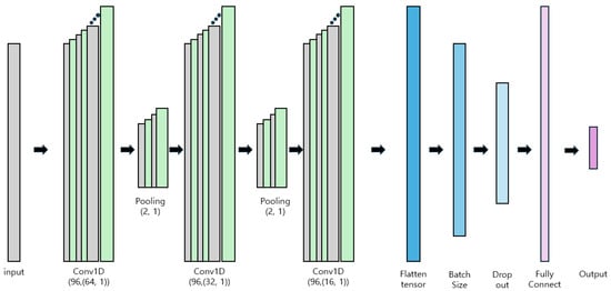 One-dimensional convolutional neural network (1D-CNN) regression analysis is a method that uses a 1D-CNN to predict continuous values based on numerical data. 1D-CNN is well-suited for processing time-series or sequential numerical data, effectively learning patterns in the input data to enhance predictive performance [29]. In the convolutional layers, fixed-size filters move across the data, extracting essential features, which are then transformed through non-linear activation functions such as ReLU. Following this, the pooling layers downsample the feature maps, reducing dimensionality and preventing overfitting by decreasing the complexity of the network. These processes can be represented as shown in Figure 3, where important patterns are preserved while compressing the data, allowing the final output layer to identify and predict patterns in continuous values [30]. 1D-CNN regression analysis is particularly suitable for handling numerical data with complex non-linear patterns. It has been applied in various fields, such as housing price prediction, stock market forecasting, and climate data analysis [31,32]. High predictive performance can be achieved by appropriately adjusting the filter size, number of layers, and learning rate.