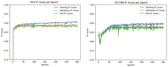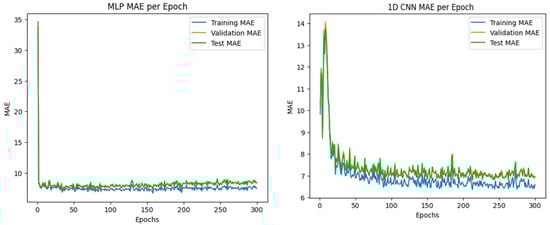 In this study, the predicted values for the training, validation, and test data were recorded at each epoch to evaluate each model’s performance. This enabled the visualization of the R2 score and MAE graphs, which were used to analyze the models’ learning trends. Dropout and L2 regularization were employed to address the overfitting problem during training for both MLP and 1D-CNN, ensuring stable model performance.