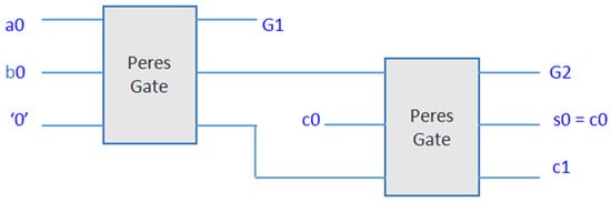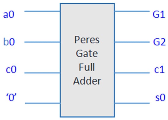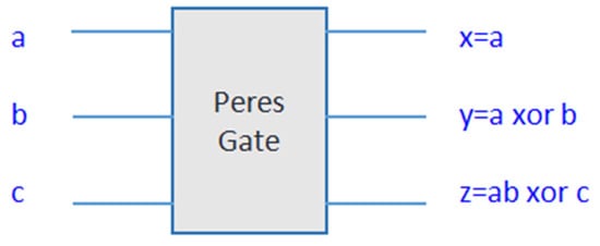 Peres gates, which belong to the class of three input quantum gates, have shown promise in implementing various logical functions, and we focused on utilizing Peres gates to design 4 × 4 reversible multipliers [,,,,,,,]. Peres gates introduced by Asher Peres in 1984 have been recognized for their universality, meaning they can be used to construct any reversible circuit [].
