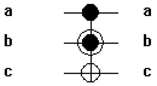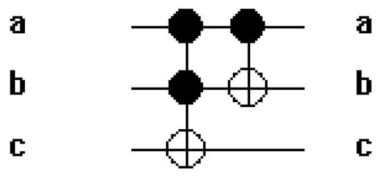 This reversibility characteristic becomes particularly relevant in quantum computing, where the conservation of information is crucial for leveraging quantum superposition and entanglement. Peres gates are particularly valuable in reversible logic design because they facilitate the creation of circuits that adhere to the principles of information conservation. Peres gate [] with three inputs and three outputs are shown in Figure 1, Figure 2 and Figure 3. Both Figure 2 and Figure 3 represent the Peres gate, but the difference between these two representations is that the Peres gate in Figure 2 has a gate count of 1, and the number of the two-qubit model is 4, whereas in Figure 3, where the Peres gate is constructed using one-three input Toffoli gate followed by one-two input Toffoli gate, the gate count is 2 and the number of the two-qubit model is 6 []. So, instead of one Peres gate, if we use two Toffoli gates to construct all the circuits discussed in this paper, then we need twice the number of Toffoli gates as compared to the Peres gate, and also, the quantum cost will further increase by 50% for the same. Similarly, comparing the quantum cost of the Fredkin gate with the Peres gate, there is an increase of 25% in the quantum cost of the Fredkin gate as compared to Peres gates, which further increases the quantum cost of the applications of adders and multipliers where we are replacing the Peres gates with the Fredkin gates []. All the circuits mentioned in this paper are constructed using the Peres gate shown in Figure 2.