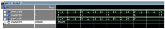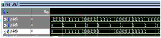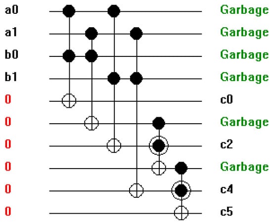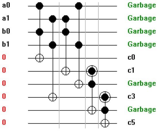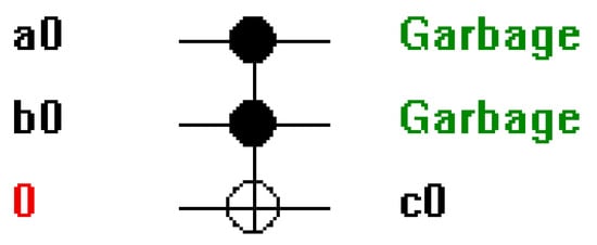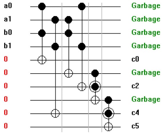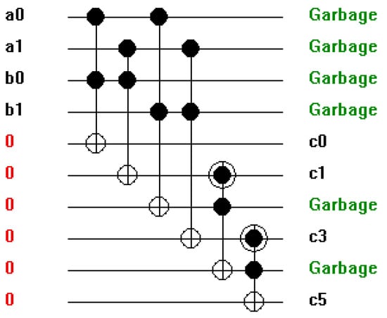The simplest form of multiplier circuit formed as a 1-bit multiplier is with a single Peres gate with multiplicand as a0 and multiplier as b0, and the third input given to the Peres gate will be the product result as the output given by c0, as shown in Figure 4. The product obtained at the output is 0 when multiplicand a0 is 0 or multiplier b0 is 0, and the maximum value of the product is 1 when both a0 and b0 are at logic 1. In Figure 5, variable a is considered to be a multiplicand, and variable b is a multiplier. The product of a two-bit number is 0 when the multiplier is 0, and multiplicand has any value between 0 and 3, whereas the maximum value of the product will be 6 when both multiplicand and multipliers have decimal value 3 or “11” in binary format. A four-level decomposition of this two-bit multiplier is shown in Figure 6.
