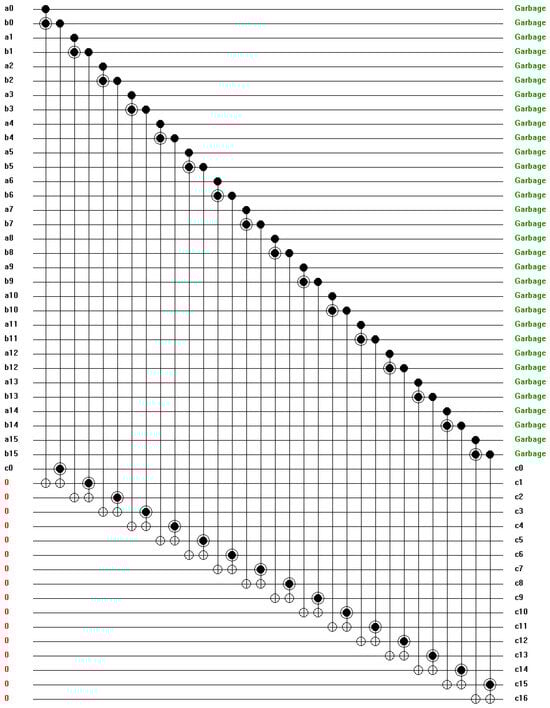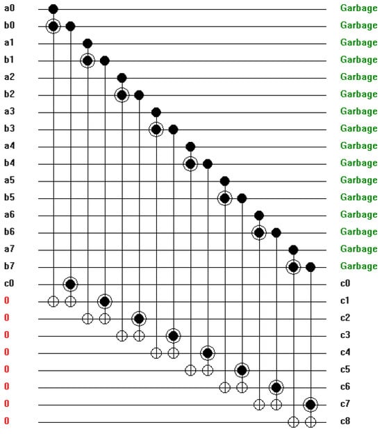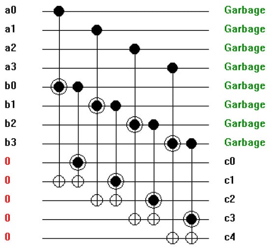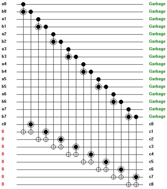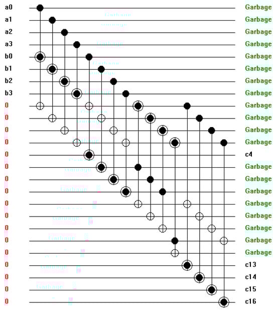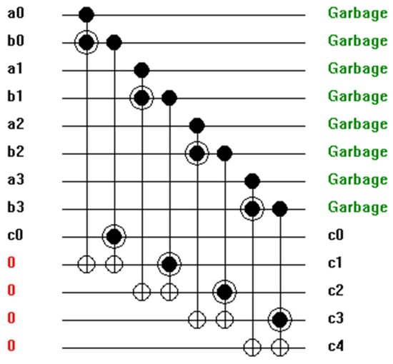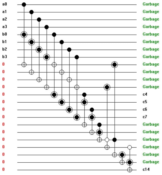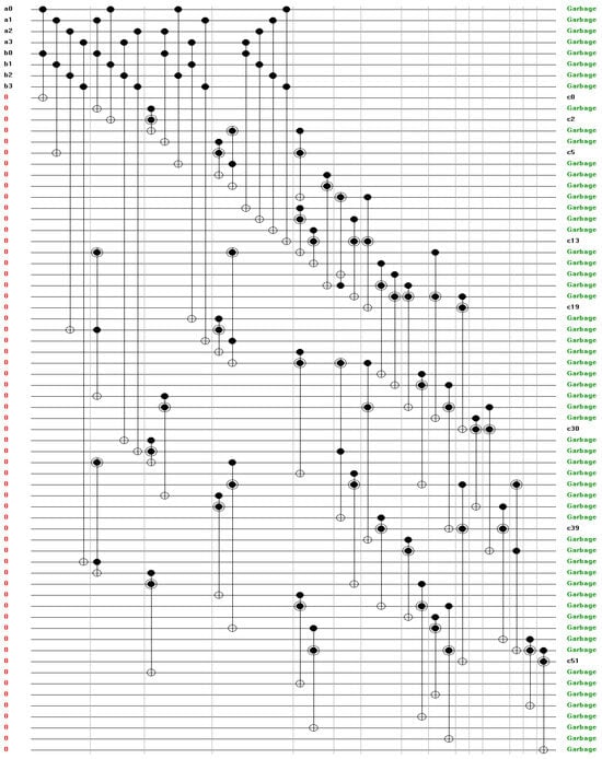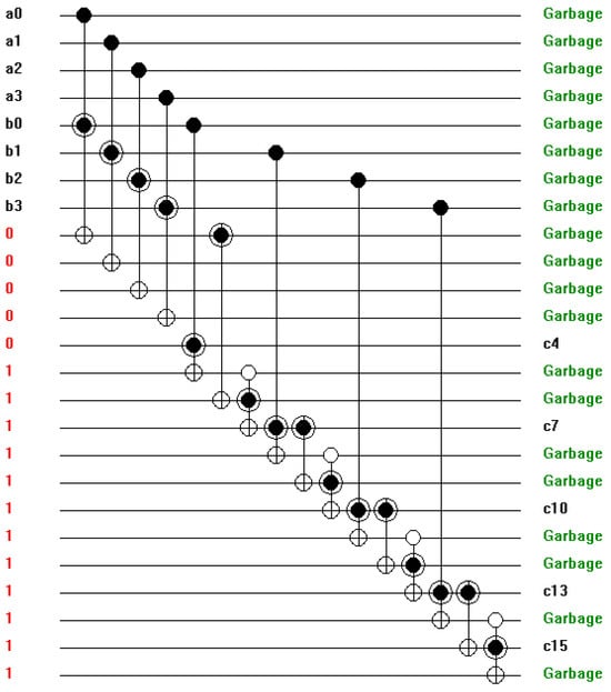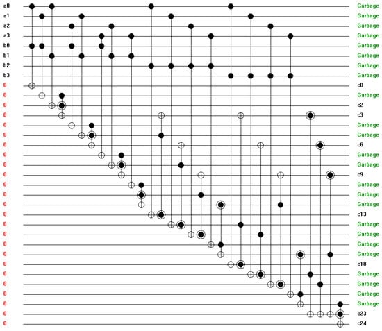 - Thaplyal, H.; Srinivas, M.B.; Arabnia, H.R. A reversible version of 4 × 4 bit array multiplier with minimum gates and garbage outputs. In Proceedings of the International Conference on Embedded System and Applications (ESA’05), Las Vegas, NV, USA, 27–30 June 2005; pp. 106–114. [Google Scholar]