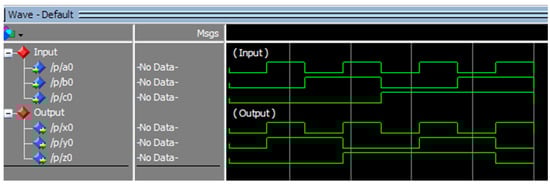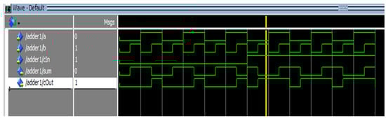 The designs were simulated using RCViewer+ and ModeSim- Intel FPGA starter Edition 10.5b, incorporating models of Peres gates and relevant circuit elements for 1,4,8,16-bit adders, 1,2,4-bit multipliers, and 2,4-bit Vedic multipliers. Simulations were executed with various input scenarios covering a range of binary input cases, including cases with and without carry-in adders, as shown in Figure 26, Figure 27, Figure 28, Figure 29, Figure 30, Figure 31 and Figure 32.
