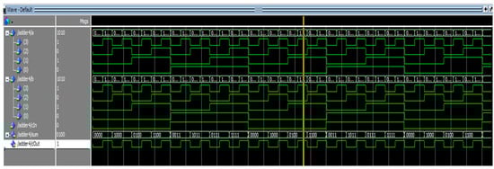 As a one-step forward in this experimentation, different 4-bit adder configurations were simulated and verified, as shown in Figure 20, Figure 21, Figure 22 and Figure 23, using ripple carry, carry look ahead, carry save, and carry skip approaches, respectively. Similarly, the designed circuits are simulated to validate their functionality and to analyze the performance in terms of speed and quantum cost. The simulation results demonstrate the successful addition of binary numbers with reversible characteristics.