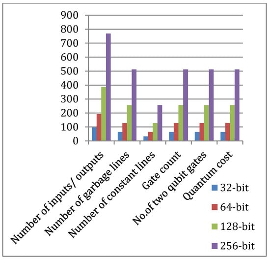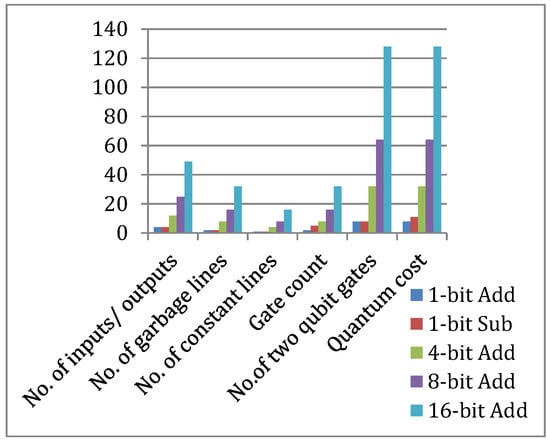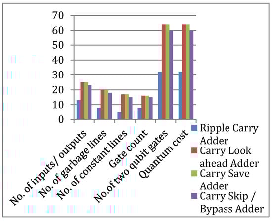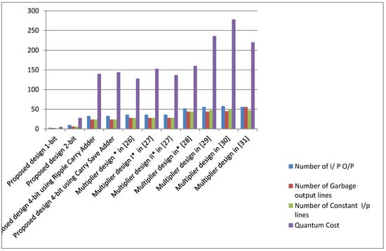 Where * indicates the partial product output and not the final product of two 4-bit numbers in all the references, and hence, the quantum cost of these [,] circuits will be finalized after adding further stages in these circuits, and hence the quantum cost for the final product of the 4-bit multiplier using the ripple carry adder and carry-save adder is definitely greater than 140 and 144, which is the landmark for the proposed multiplier circuit. A 10% to 48% reduction in the quantum cost is observed, referring to the above table parameters in the proposed designs.