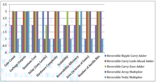 The analysis also considered potential optimization opportunities for the design. This includes exploring advanced reversible gates, circuit restructuring, or algorithmic enhancements to further improve performance metrics and address any identified limitations. The comprehensive evaluation of performance metrics provides valuable insights into the strengths and potential areas of improvement for the RCA design using Peres gates. The outcomes of these analyses contribute to the broader understanding of reversible logic circuits and their applications in emerging computational paradigms. In Figure 37, Levels 1, 2, and 3 on the Y-axis represent low, moderate, and high levels, respectively. From this figure, we can conclude that the Vedic multiplier is the best reversible multiplier with low gate count, quantum cost, gate level delay, hardware complexity, scalability, area, and number of Ancilla bits with high garbage outputs, which can be neglected as the reversibility efficiency provided by this circuit is high. The ripple carry adder constructed using reversible logic has all metrics considered to be at a moderate level, but it provides higher gate level delays, which can be neglected as the hardware complexity and area in terms of gates is also less. After examining all the adders and multiplier circuits using Toffoli and Peres gates, a comparison table for designing various adders and multipliers using reversible logic is prepared and presented in terms of a chart, as shown in Figure 37. The key parameters considered in the design of reversible circuits include all the metrics used to measure the performance of these circuits.