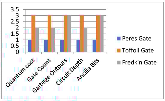 Figure 38 shows the performance comparison between the different metrics used for different reversible logic gates used in this. The parameter levels are shown with bars of heights 1, 2, and 3 representing low, moderate, and high, respectively, for respective reversible logic gates. Fewer gates are required due to the Peres gate’s dual function of AND and XOR, which further minimizes the quantum cost and also fewer garbage outputs than Toffoli and Fredkin-based designs. From this chart, it is quite clear that the use of the Peres gate for the design of adders and multipliers outperforms the other reversible gates.