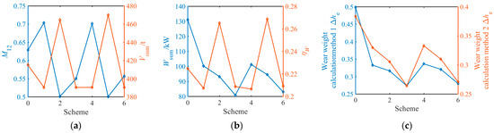 Table 9. Among the optimized performance indicators, the mass fraction of particles below 12 mm is 79.6–112% of the original scheme, and the maximum energy consumption of the same output is 63.49–82.08% of the original scheme. According to the wear weight method 1, the equivalent wear of the same output is 56.61~71.72% of the original scheme. According to the wear weight method 2, the equivalent wear of the same output is 71.18~91.42% of the original scheme.