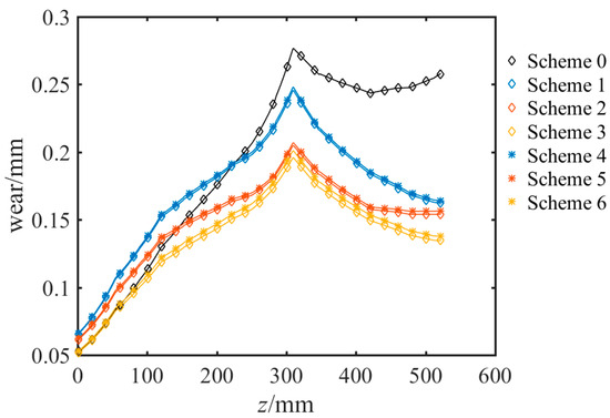 The wear of different crushing chamber depths hourly of each optimization scheme is shown in