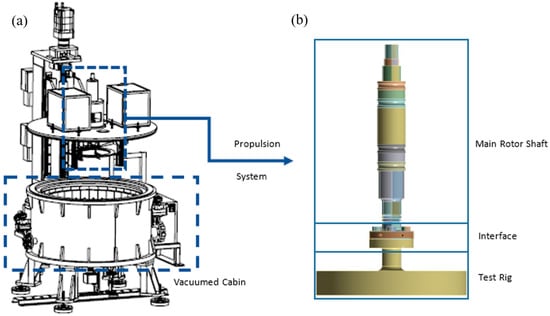 Spin test rigs are systems used to test the dynamic phenomena and structural strength limits of components operating at high speeds [1,2]. The purpose of the applications carried out in the test rig is to examine phenomena such as plastic deformation, crack propagation, and burst by rotating the part under test at high angular speeds and exposing it to centrifugal load [3]. Tests can be performed under vacuum and at high temperatures, depending on the operating conditions of the test rig. Components operating at high speeds, such as turbines and compressors of gas turbine engines, high-speed gears, and rotating parts of turbochargers and centrifugal pumps, can be tested under maximum load conditions in spin test rigs [4,5,6,7,8]. During the test stages, the aim is to expose the disc structure to burst by accelerating to the targeted speeds. However, before the disc bursts, plastic deformation will occur in the material. This associated plastic deformation will cause crack propagation [9,10]. The burst phenomenon will occur as the crack size increases and the disc continues to be exposed to centrifugal force. The spin test rigs operate under vacuum and are driven by an electric motor running at high speeds for structures with a low inertia tensor [11,12,13,14,15]. The most important reason for operating the system under vacuum is to reduce the aerodynamic torque to zero, making electric motor selection easier and eliminating aerodynamic effects during the test. With vacuum, both aerodynamic damping is eliminated and convective heat transfer is prevented [16,17,18,19]. In this way, a temperature gradient is achieved on the part. Without a vacuum, it would be almost impossible to capture the temperature gradient on the test specimen, which would be exposed to convective heat transfer [20,21,22].