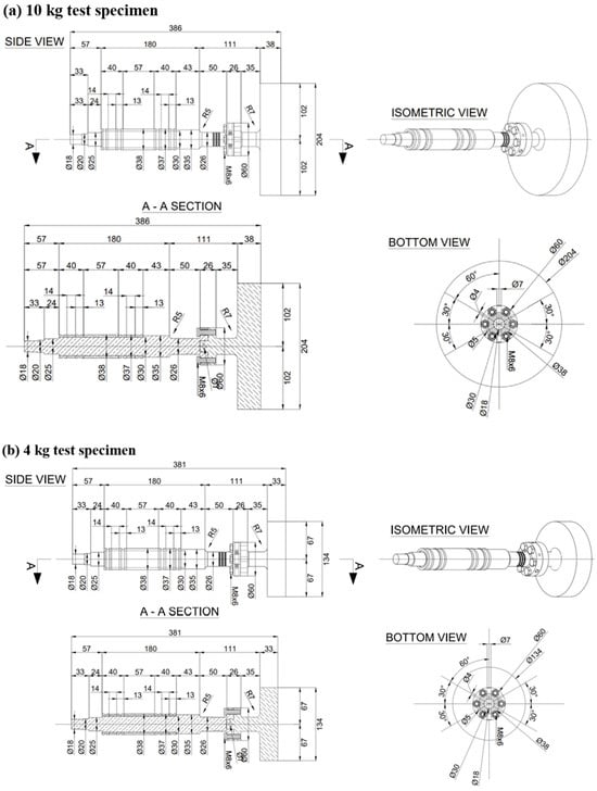 Based on the layout created according to the Matlab Simulink model, finite element and testing studies were also carried out for a test specimen with a mass of 4 kg. Along with these studies, the accuracy of the model created in the Simulink environment was also compared with another test data. The finite element studies of the 4 kg test specimen were performed using both the general axisymmetric approach and the three-dimensional approach, similar to the 10 kg test specimen. The connection details for the 4 kg test specimen and the drive shaft are presented in Figure 16.