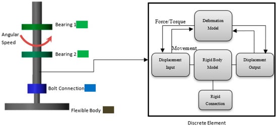 The DM of the shaft represents a flexible body as a combination of a rigid-body model and a deformation model. The rigid-body model accounts for the body’s rotation and translation movements without any deformation. This model calculates shape changes at specific points on the body, which are derived using the rigid-body model. Achieving accurate results with this method relies on the spatial distribution of the geometry’s mass, inertia, stiffness, and damping properties. The DM divides the body into a mesh consisting of numerous nodes, each with six degrees of freedom. The details of the DM are depicted in Figure 4.