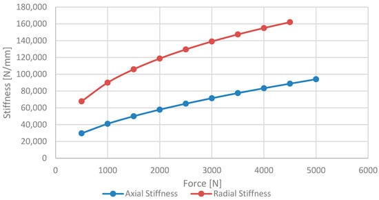 In the rotor dynamics studies, bearing stiffness values were not treated as constants in either the radial or axial directions; instead, the stiffness characteristics obtained from tests were utilized as input data. The nonlinear stiffness behavior curves for both radial and axial directions are presented in Figure 6. When applying bearing stiffness values in rotor dynamics calculations, the selection was based on the allowable unbalance load for radial stiffness, while mounting loads were considered for axial stiffness. This approach incorporates the nonlinear stiffness effects of the bearings into the calculations. As a result, the rotor dynamics calculations yield results that are more consistent with the experimental data.