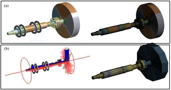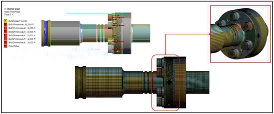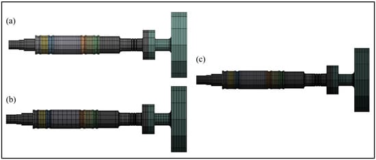 3D analyses were utilized for both stress distribution and alternating stress calculations in the rotating components of the shaft assembly. The primary goal of employing 3D analysis was to accurately capture stress distribution in non-axisymmetric regions with a high degree of convergence. The 3D analysis model, which facilitated these stress calculations, is depicted in Figure 9, with the mesh properties of the finite element model detailed in Table 1. In contrast, 2D analyses would exhibit significant error rates in non-axisymmetric areas, thus necessitating the use of 3D models for precise stress calculations. Modal analyses, however, were conducted more efficiently using general axisymmetric models in 2D, which allowed for rapid computation of stiffness and mass matrices. This approach enabled the swift execution of parametric modal analyses, with results compared against other simulations and experimental data.