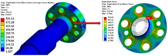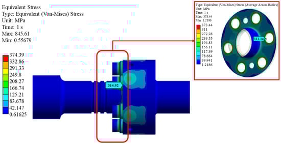 The defined material properties were used as input data for the analysis model. Contact loads arising from interference fit, bolt pretensions, and angular velocity were applied as boundary conditions for the 3D structural simulations. The Von Mises stress distribution for the shaft is shown in Figure 13 for a 10 kg test specimen. Based on the stress distribution, the maximum equivalent stress was calculated to be 374.39 MPa. This value is below the yield limit, indicating that no plastic deformation is expected to occur in the shaft.