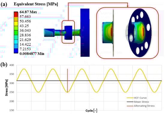 The stress distribution calculated from the structural analysis, using 31,920 rpm (equivalent to 532 Hz) as input data for a 10 kg test specimen, is shown in Figure 13. However, the alternating stresses resulting from the critical speed that would occur if the shaft operated at 532 Hz were calculated using harmonic analysis. When applying a damping coefficient of 0.5%, as determined from local impact tests, the maximum alternating stress is found to be 64.87 MPa. In contrast, applying a damping ratio of 2.8%, obtained from the hammer test conducted on the assembly, results in a maximum alternating stress of 11.54 MPa. Both the maximum equivalent stress from the structural analysis and the maximum alternating stress from the harmonic analysis affect the same section of the shaft. Therefore, a high cycle fatigue evaluation was performed for this region, and the material yield limit was not exceeded even when the lowest damping ratio was applied.