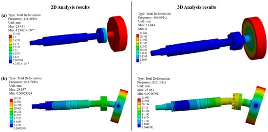 The mode shapes obtained from the two- and three-dimensional modal analysis results for the 4 kg test specimen are presented in Figure 17. The mode identified at 448 Hz is a torsional mode, while the mode detected at 635 Hz can be classified as a bending mode.