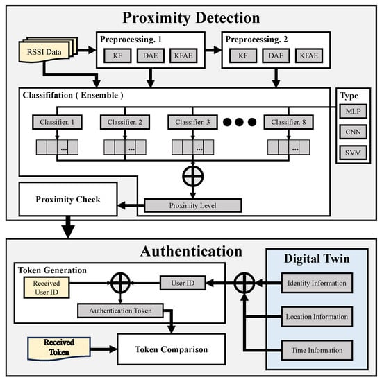 Because the system determines whether an authentication process starts based on measured proximity levels, the performance improvement of proximity detection increases the system’s stability. Results of proximity detection experiments show that using an ensemble and various pre-processing results in reduced error rates compared to only using raw data. We find that MLP and 1D-CNN are better than SVM in the system with pre-processing and ensemble. Additionally, execution times for using raw data and using the ensemble are shown. So, a trade-off between accuracy and time is found.