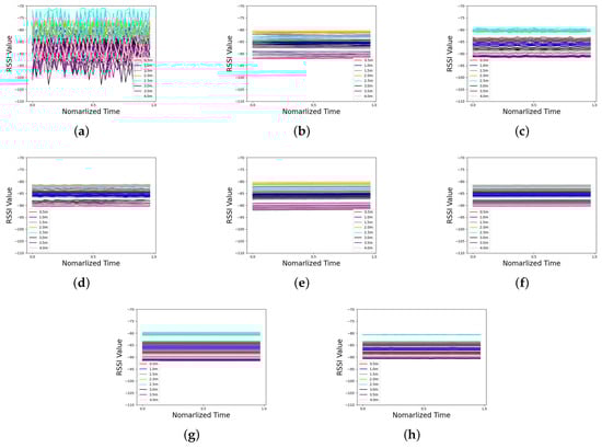 RSSI data with various pre-processing types. (a) Raw RSSI data. (b) RSSI data with KF. (c) RSSI data with DAE. (d) RSSI data with KFAE. (e) RSSI data with KF + DAE. (f) RSSI data with KFAE + DAE. (g) RSSI data with DAE + KF. (h) RSSI data with DAE + KFAE.