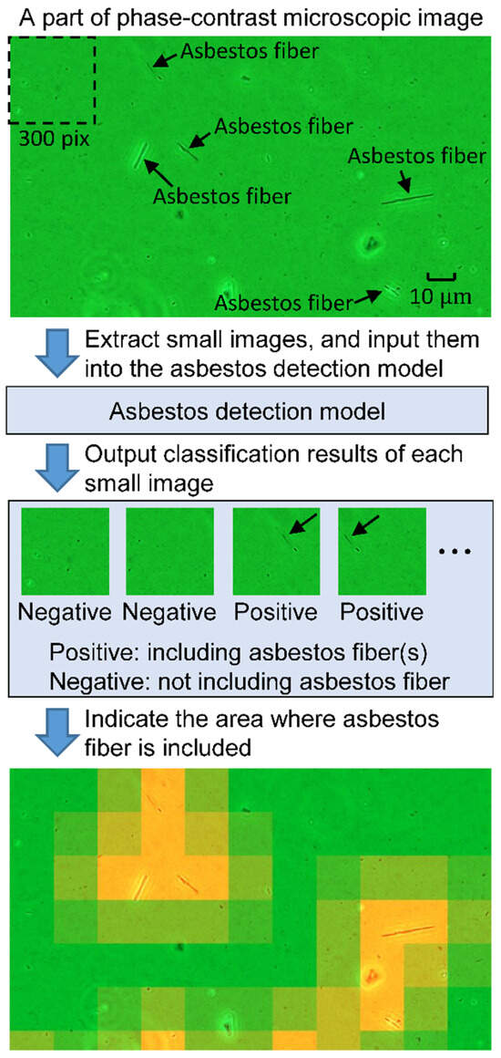 A flow chart of the asbestos detection in this study is presented in Figure 1. The input data consisted of a fragment of a PCM image. The PCM image was segmented into small regions and introduced into the asbestos detection model, which determined whether the small input area contained asbestos fibers. By repeating the same judgment for all the small regions in the PCM image, the model estimated the presence or absence of asbestos fibers in the PCM image.