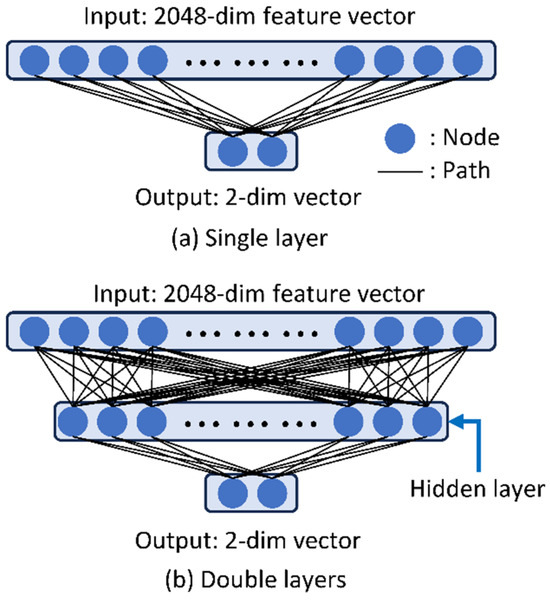 The configuration of the classifier when using FC layers is displayed in Figure 2. The FC layer computes the value of each element in the output vector by using the weighted sum of each element of the input vector. Because the output vector is obtained by a linear combination of the input vector elements, a single FC layer (Figure 2a) can only address linearly separable problems. This problem is overcome by stacking two FC layers (Figure 2b). Therefore, the performance of the model can be improved by using double FC layers. We created models with single and double FC layers for the classifier and compared their performance.