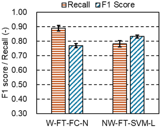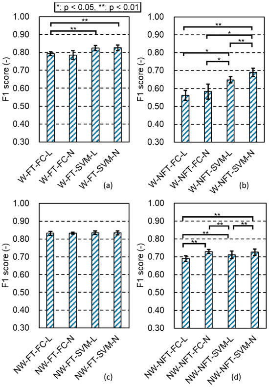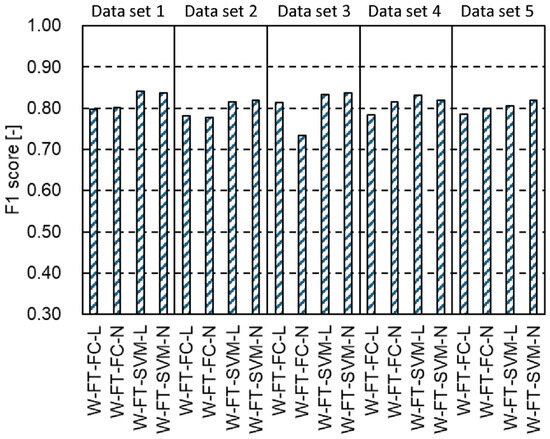 For the hyperparameter-optimized models, we evaluated model performance on the validation dataset using F1 scores. Figure 5 shows the detection performances of the models that utilized class weighting and fine-tuning. Because the data were randomly sorted into five datasets, the classification difficulty could vary slightly from one dataset set to another. However, the significant performance relationships among the models were generally equal for all datasets. For example, the W-FT-SVM-L model consistently had a higher F1 score than the W-FT-FC-L model on each dataset, and the difference passed Student’s paired t-test (p < 0.05).