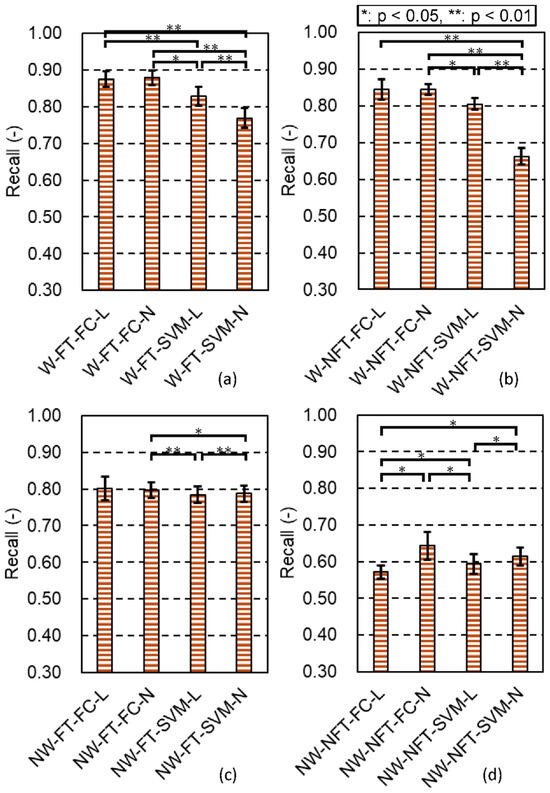 A similar evaluation was performed for the recall (Figure 7). The recall values exhibited a different trend from the F1 scores. In the case of class weighting (Figure 7a,b), the model using FC showed a significantly higher recall than the models using SVM. In addition, the nonlinear SVM model exhibited reduced performance compared to the other models. However, in the case without class weighting, there was minimal or no significant performance difference between the FC and SVM. In the case of no class weighting or fine-tuning, the performance improved when nonlinear classifiers were used.