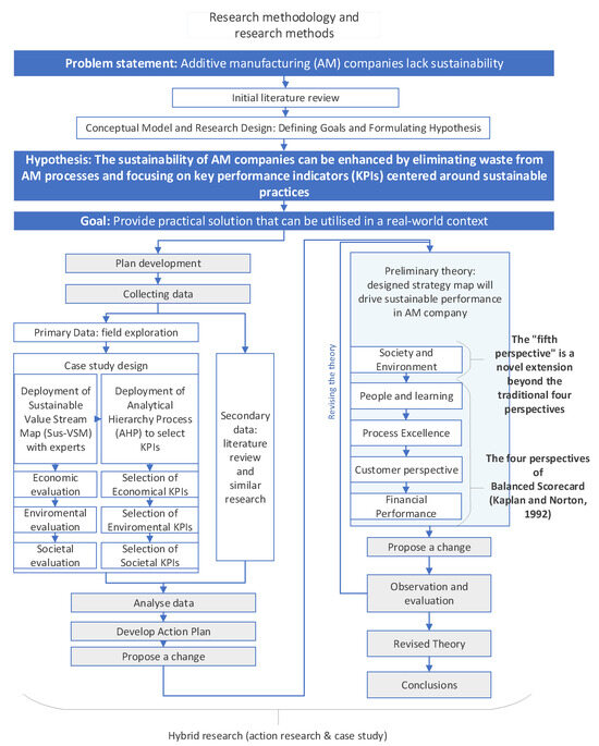 The research design incorporated action research and a case study-based approach [53]. The research methodology steps and the research methods are presented in Figure 1. Initially, a comprehensive literature review was conducted to identify existing sustainability theories. Next, a structured case study was developed where the data were collected. The data collection process consisted of two main elements: field exploration (which included the implementation of Sus-VSM, and selection of KPIs) and a literature review, which provided a secondary data. The secondary literature review involved a comprehensive search of the Oria academic database for articles relating to the selection of KPIs in AM, along with concepts related to Sus-VSM, BSC, and SSM.