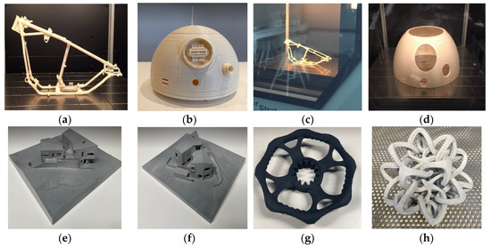 (a,b) FDM, examples of parts produced by MEISLE AS, Norway; (c,d) FDM, examples of parts in production process by MEISLE AS, Norway; (e–h) MJF—examples of parts produced by MEISLE AS, Norway.