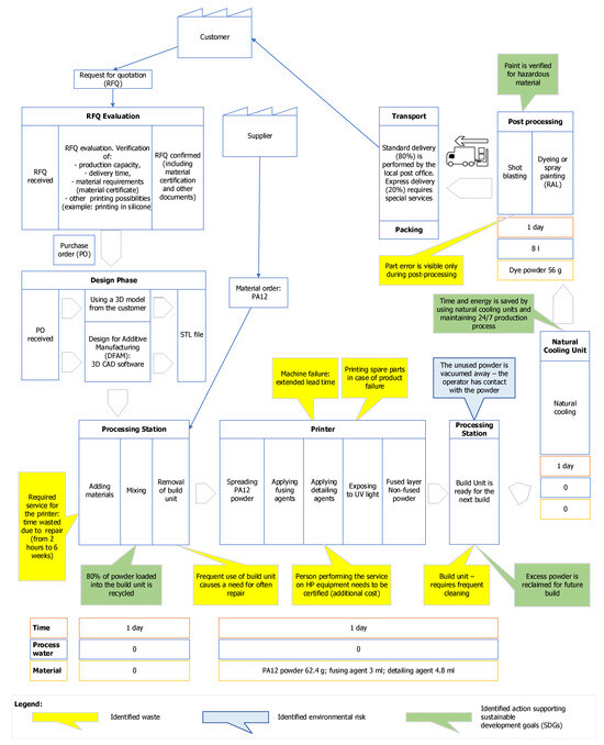 Sus-VSM for production process with multi-jet fusion (MJF)—current state (The chart was created for the production of a specific component with a volume of 30 cm3).