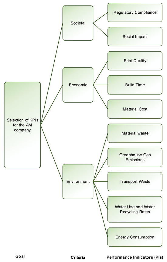 Figure 5 depicts the decomposition of the decision problem using the AHP method [101] for the case study company. The model incorporates three primary criteria: environmental, economic, and societal aspects, based on the TBL theory. The selection of the AHP method for this study was driven by its widespread use in decision-making within the area of sustainable development and the field of AM [38,102,103]. Additionally, authors employed the AHP method to identify performance measures for integration into BSC for strategic management [104,105].