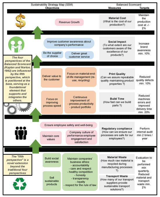 Additionally, this paper builds upon prior research [9,26,27,28,29,30,31] by exploring the integration of sustainability into the balanced scorecard (BSC) framework [32]. It introduces a fifth perspective, the “Society and Environment” perspective, which is designed to encompass both environmental and social aspects. This addition enables organisations to balance financial performance with sustainable development goals (SDGs), thereby aligning strategic objectives with broader societal and environmental responsibilities. The manuscript ultimately proposes a sustainability strategy map (SSM) to enhance the effective implementation of the BSC and to facilitate the achievement of strategic sustainability goals. This development builds on previous research demonstrating the efficiency of strategy maps in aligning corporate strategies with sustainability objectives [33,34,35].