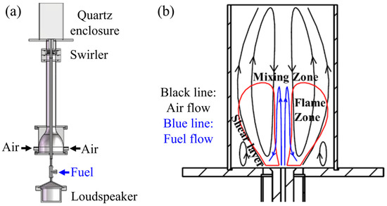 Figure 1. (a) Schematic of the burner and (b) flame structure of non-premixed swirling flame [59,60].