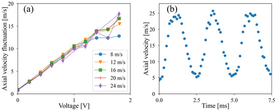 Figure 2. (a) Axial velocity fluctuation of the fuel at the jet nozzle as a function of the loudspeaker voltage for 5 different mean fuel velocities and (b) time-resolved velocity under a loudspeaker voltage of 0.6 V (FMFRF amplitude ~80%) along the jet centerline at the downstream height of 1 mm above the nozzle exit in three acoustic periods with a time interval of 0.1 ms.