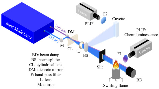 The high-speed imaging setup layout is depicted in Figure 3, described in detail in our previous work [61]. The flame behavior for every case was evaluated through OH*-CL CH2O- and SO2-PLIF.