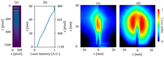 For PLIF data processing, the background was first subtracted from every instantaneous raw image. Second, the inhomogeneity of the laser sheet intensity was considered. During the experiments, a beam splitter was placed in the incident path to reflect a small portion of the incident laser sheet into a cuvette filled with ethanol, which was mixed with a tiny amount of Rhodamine 6G dye. The cuvette was placed at a specific position where the distances from the beam splitter to the burner outlet and the cuvette were identical. The fluorescence from the Rhodamine 6G/ethanol dye solution was recorded using another high-speed camera (Phantom v2012, Vision Research, Wayne, NJ, USA), allowing the temporal shot-to-shot correction for the PLIF signals. An example of the PLIF image recorded from the dye in the cuvette is shown in Figure 4a, and the intensity profile is plotted in Figure 4b by integrating the PLIF signal along the x-direction. Then, the background-subtracted PLIF images were corrected by the corresponding single-shot fluorescence intensity profile. Two images before and after correction are displayed and compared in Figure 4c,d, and the influence of the intensity inhomogeneity of the laser sheet can be relieved.