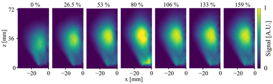 Figure 5. The left half of the inverse Abel-transformed time-averaged OH*-CL images with varying FMFRFs (displayed at the top of every image) at the conditions with a mean fuel mass flow rate of 0.142 g/s and air velocity of 17.1 m/s.