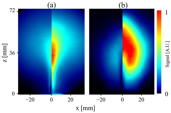 The obtained chemiluminescence images were averaged over 100,000 shots, and then a two-dimensional (2D) median non-linear filter was applied for noise reduction (5 × 5-pixel filter size). The inverse Abel transform was used to obtain a mean 2D flame shape.