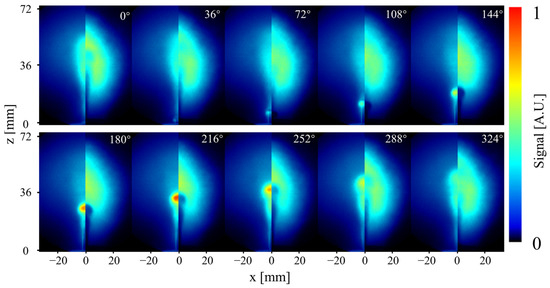 Figure 7 displays the phase-averaged CH2O- and SO2-PLIF measurements from flames with 80% FMFRF at a mean fuel mass flow rate of 0.142 g/s. Ten phases during one acoustic period are displayed with an interval of 36°, corresponding to a 250 μs separation. Phase 0° is the time when the fuel is injected into the combustion chamber. A bulge of CH2O-PLIF signal was formed at the chamber entrance and spread downstream periodically. The area and intensity of the bulge both increased as the phase increased. The phase-average distribution of the SO2-PLIF signal remained basically unchanged, with tiny alterations along the central axis, which was far from the heat release zone denoted by OH*-CL distribution demonstrated in Figure 5, indicating that the influence of FMFRF was local and did not alter the global flame directly. Until phase 252°, the boundary of the CH2O bulge perfectly complemented the SO2-PLIF signal. After that, these two signal distributions overlapped in the downstream area because the SO2-PLIF distribution was broader than the reaction zone [51,64]. The CH2O- and SO2-PLIF signal intensities were visible near the fuel outlet axially and radially, indicating a quick temperature rise.